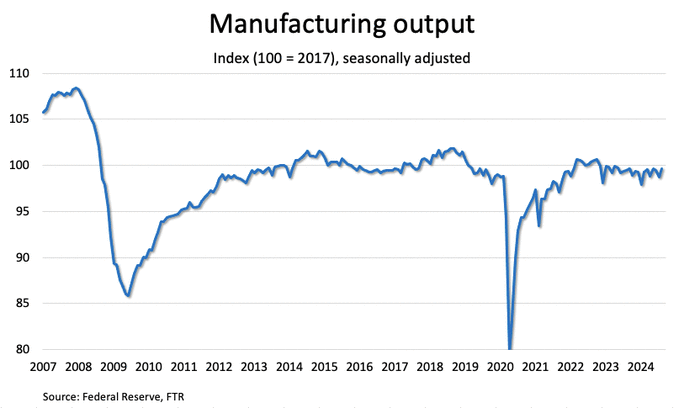 Total chemicals production recently has been the strongest since 2012. But total manufacturing output in August was barely any stronger than it was a year ago and below levels seen at various periods between 2012 and today.