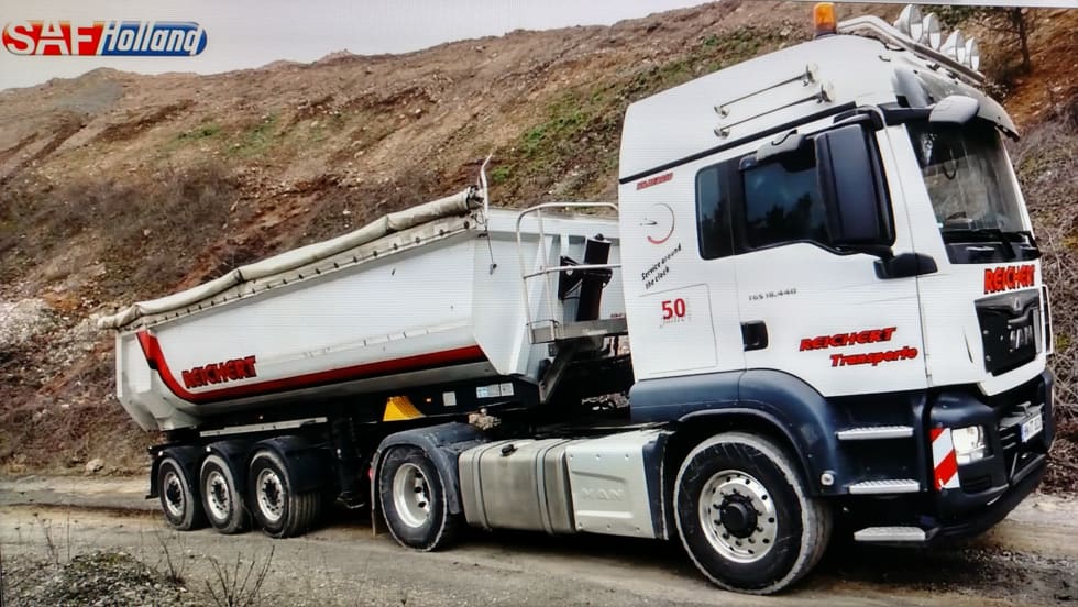 “SAF Trak” axle is powered from the tractor’s hydraulic wet kit. On the trailer, two hydraulic motors, one at each axle end, turn the wheels to help get the rig moving in slippery conditions.