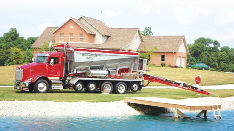 Dump trucks can do a lot of hauling and delivery work, but there’s a limit to how precisely certain loads can be placed. One alternative is the “slinger,” which adds a high-capacity conveyor-belt mechanism to a hopper body.