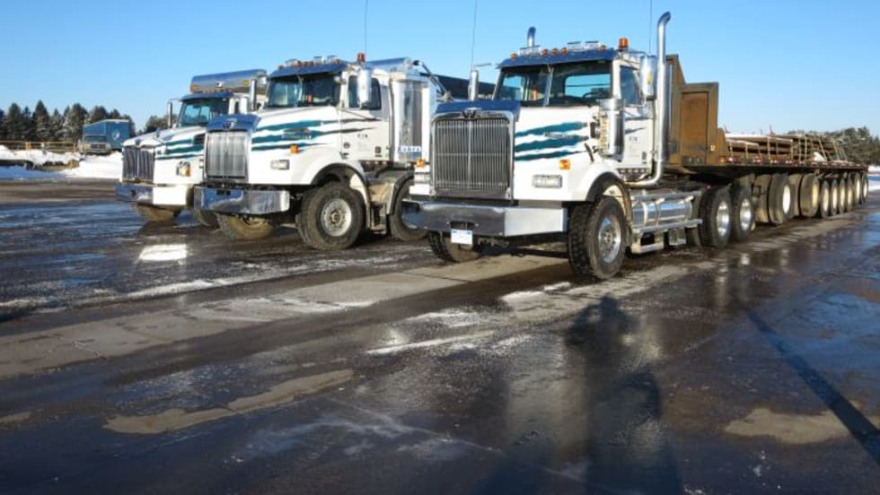 The tough, burly tractor and its 600-hp diesel work hard to pull a heavy “train” trailer in frozen conditions.