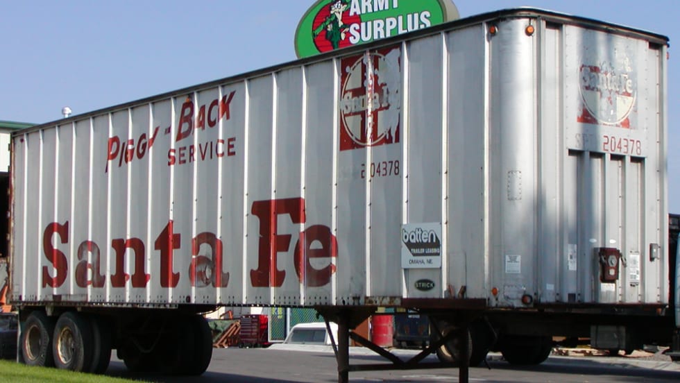 This Strick trailer is part of intermodal history going back more than 50 years. It was one of a large group bought by the Atchison Topeka and Santa Fe Railway for coast-to-coast Flexi-Van service it ran with the New York Central System. This particular trailer was spotted in 2004 in Omaha, Neb., after it was retired from piggyback service.