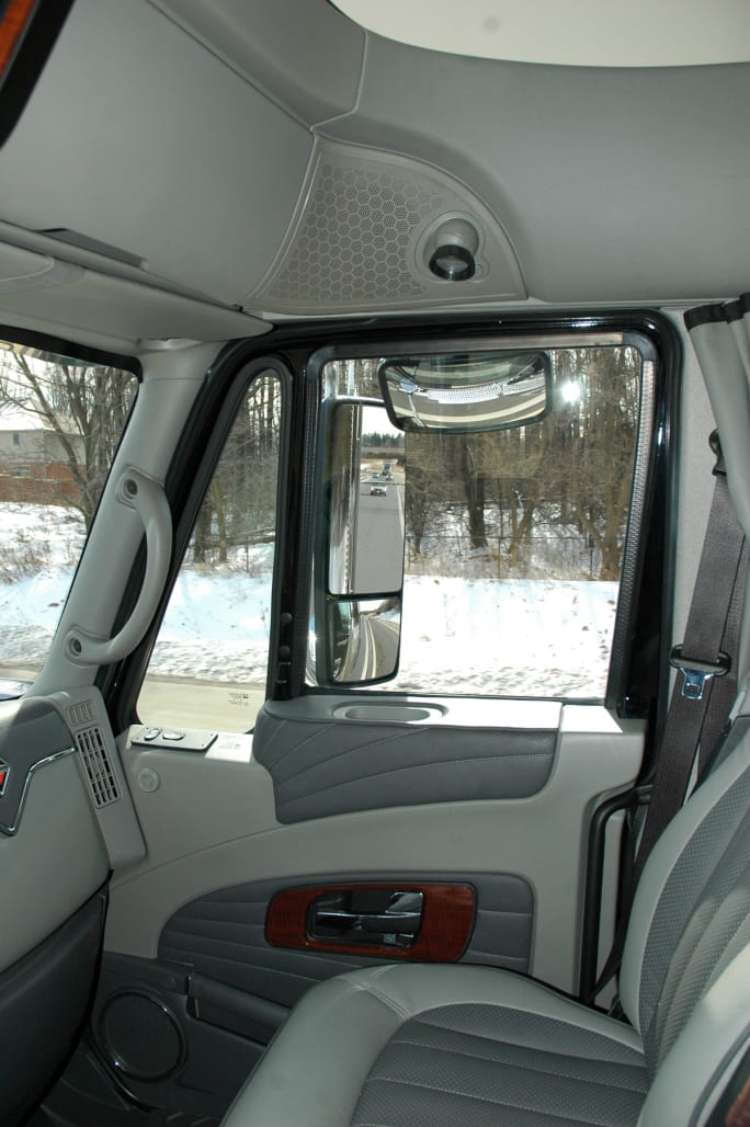 Stoneridge also offers a third monitor, which is essentially a look-down view that improves upon the convex mirrors mounted about the passenger door. On the test truck, that monitor was mounted top and center of the windshield. With the associated camera mounted in the right-hand camera wing, it covered an area from the front bumper to the drive wheels and a bit more than a traffic lane wide.