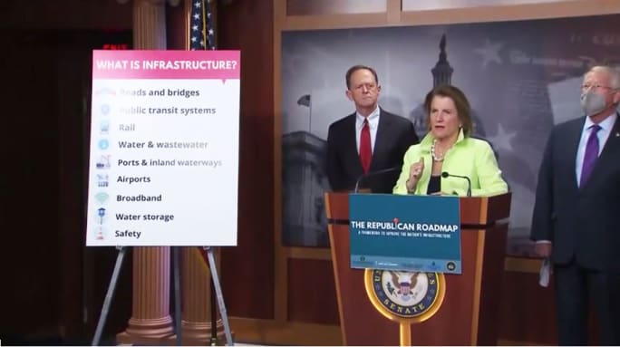 Sen. Shelley Moore Capito, ranking member of the Senate Environment and Public Works Committee, leads the press conference to announce the Senate Republicans' infrastructure proposal.