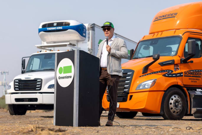 Greenlane CEO Patrick Macdonald-King speaks at the opening of a new truck charging facility in Colton, California.