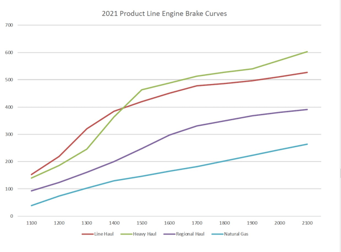 The red line represents a line-haul engine, while the green line represents a heavy-haul engine — presumably Cummins’ Efficiency and Performance series engines. This is Cummins-specific, obviously. Other OEMs’ engine brake performance curves will be similar but not exactly the same.