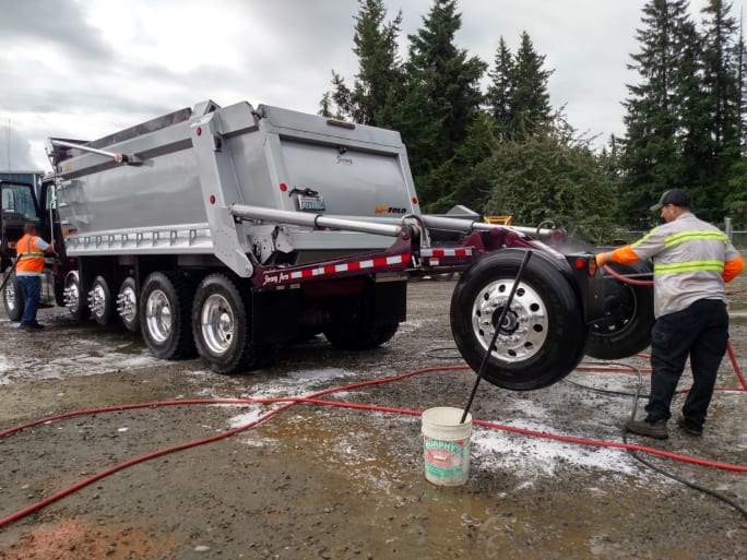 New additions are a pair of “super solo” straight trucks, like this one getting a bath. They have seven axles, including the swing-down “booster,” and can gross 82,000 pounds while carrying a 26-ton payload, says the fleet’s operations manager. Most power units are Mack Granites.