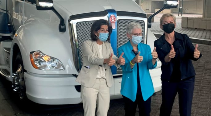 A Kenworth zero-emissions T680 fuel-cell-electric day cab served as a backdrop for a major U.S. Department of Energy (DOE) press conference. During that event, Energy Secretary Jennifer Granholm announced $60 million in funding for 24 research and development projects, including projects related to battery and electrification technologies and the transportation industry aimed at driving down emissions.