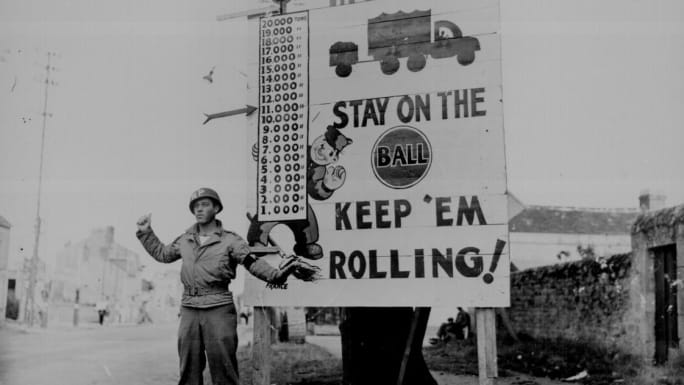 A U.S. Army MP gives Red Ball Express truckers priority in the rush to get supplies to the front lines.