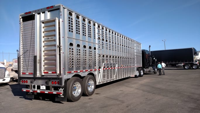 Wilson livestock trailer is an example of a “wheels back” type exempt from the shock-absorbing RIG requirement under 393.86 of the motor carrier safety rules. Its rearmost axle and tire-wheel assemblies would keep a car from riding under the trailer’s structure, where its bumper covers most of the lateral area.