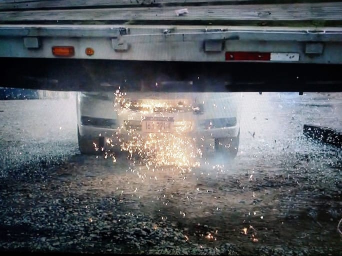 The mentally disturbed suspect had all but admitted killing a young woman (“She wouldn’t stop screaming”) and seems remorseful, but doesn’t want to face the music, as they used to say on older cop shows. That’s why he jumps in his car and races toward a conveniently parked flatbed trailer and T-bones it. Smash! Flying bits of plastic (in the old days they were glass)! Trailer’s jolted upward! Car nose dives slightly, but not enough for the cabin to completely under-ride the trailer’s structure. Car rests. Dust begins clearing.