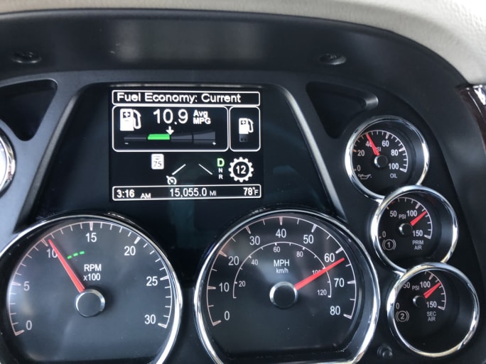The Peterbilt dash has a fuel economy gauge that shows when the driver is operating above or below average fuel economy. It displays one or two green bars either side of average. While going up a short hill, I feathered the throttle trying to keep only one bar below average lit, but when using cruise control on a similar hill, two bars were always lit. On top of that, the electronic turbo-boost gauge and the sound of the engine are good indicators of how much fuel is being burned to maintain speed.