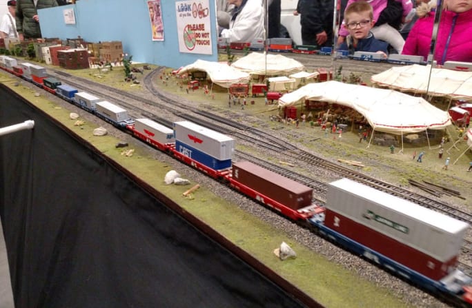 Containers have grabbed a large share of the intermodal freight business, and here’s a miniature trainload of them at the model railroad show. Standardized sizes contribute to their efficiency, but containers visually vary only in color and markings so are aesthetically boring.