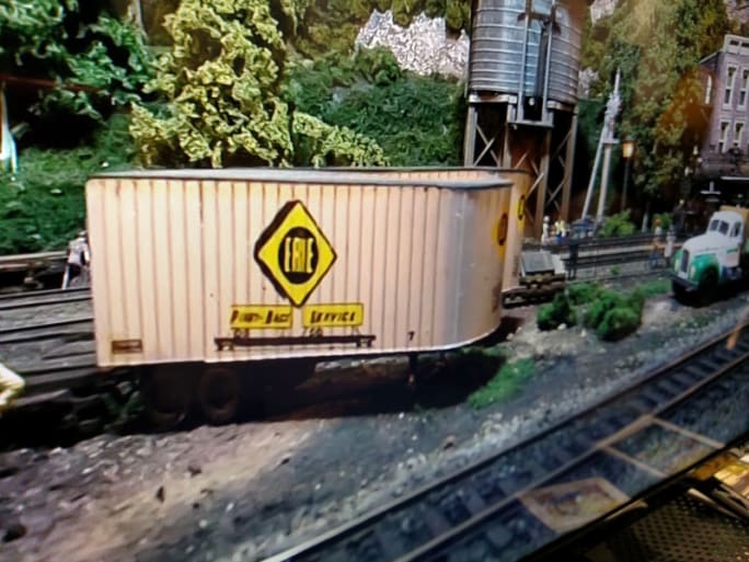 This pup trailer is a “wedge,” with its rear taller than its front – once a popular way to add “cube” to a vehicle’s capacity. The Erie was among many railroads that ran their own piggyback services; some operated complete truck lines until the old Interstate Commerce Commission, concerned about business dominance, decreed that they had to leave trucking.