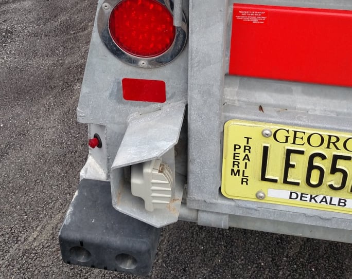 Each corner has a beefy rubber bumper, and the stalk-type license plate light is protected by a steel guard. This trailer has a Georgia plate, but you never know where a U-Haul rental will be registered.