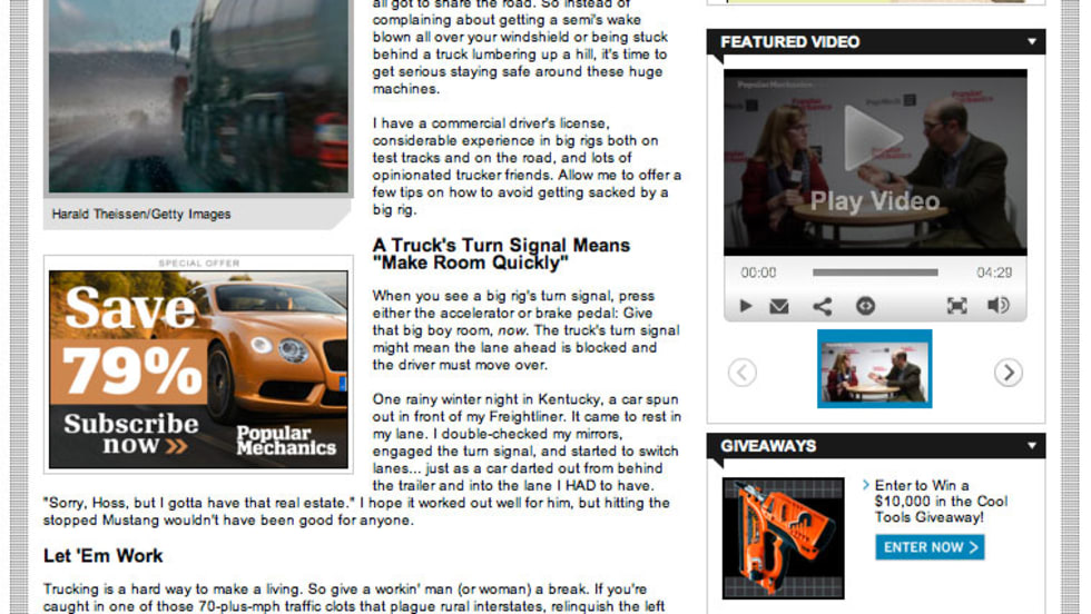 Read More →Popular Mechanics magazine, which takes on topics ranging from "Ab Machines That Work" to "How to Make Beer," now adds sharing the road with trucks to its repertoire.