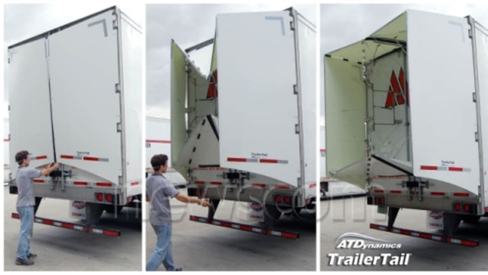 A couple of new, sophisticated trailer aero add-ons were on display caddy-corner to each other on the show floor at the recent American Trucking Associations management conference and exhibition