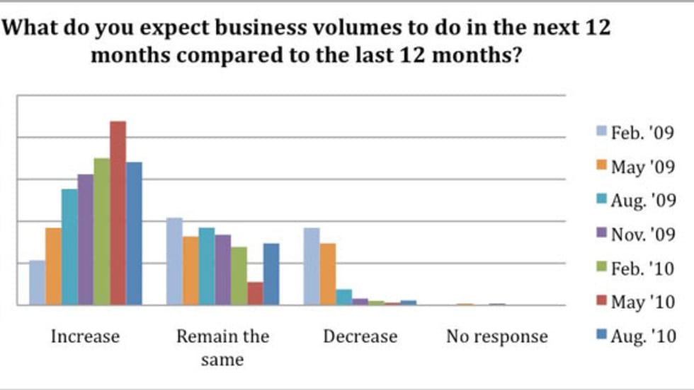 Transport Capital Partners' latest Business Expectation Survey found that like the last five quarters, carriers have remained fairly optimistic about future freight volumes. However, the optimism has been somewhat tempered -- although only a fraction believe volumes are going to decrease or that we're heading into a double-dip recession