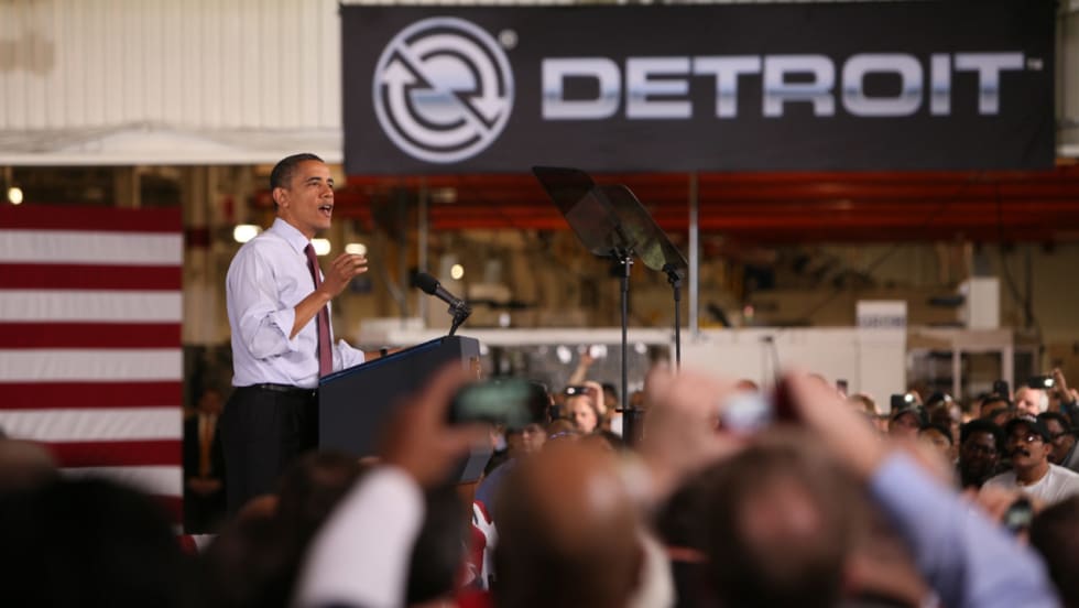 President Obama addresses an enthusiastic crowd at the Detroit Diesel plant in Redford, Mich. Dec. 10, 2012
