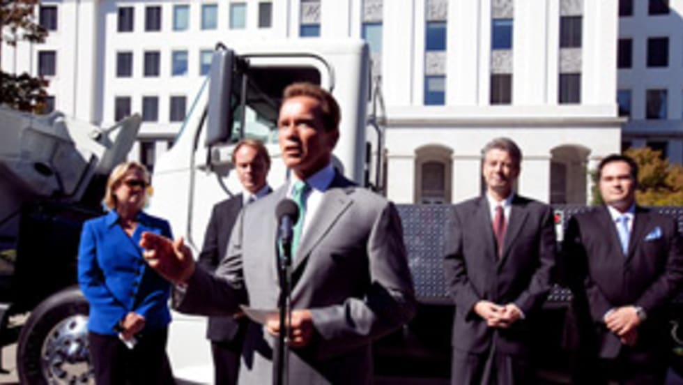Gov. Arnold Schwarzenegger was on hand at California's State Capitol building in Sacramento to debut Vision Industries' Tyrano truck Tuesday, the zero emission hydrogen fuel cell/plug-in electric hybri