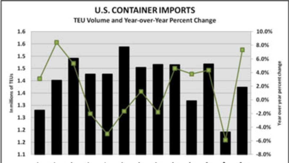 Driven by a surge in furniture and auto parts shipments to the U.S., containerized imports in March rose 7.3% over 2011. This increase to 1.37 million 20-foot-equivalent units came on the heels of a 5.9% decline in February