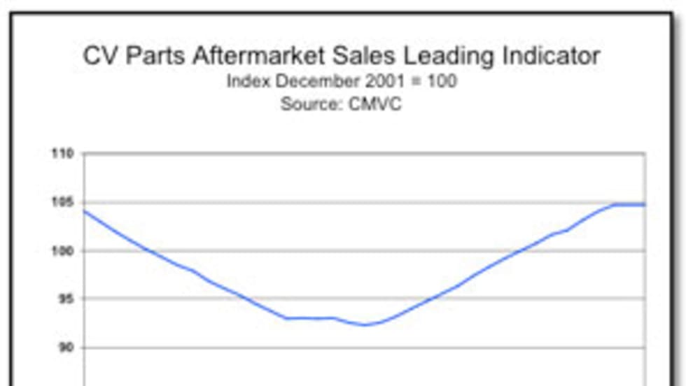 A new industry index that tracks aftermarket parts rose slightly in January. Commercial Motor Vehicle Consulting's new CV Aftermarket Parts Leading Indicator increased 0.03% in January to 104.70 (January 2001=100) following a 0.01% decrease in December (104.67) and a 0.61% increase in November (104.68)
