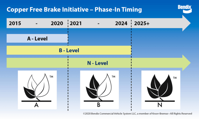 The phase-down timeline for non-copper friction material includes a 5% copper limit by 2021 and a 0.5% copper limit by Jan. 1, 2025.