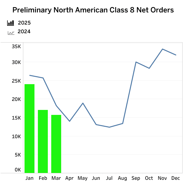 FTR and ACT Research reported that preliminaryNorth American Class 8 net orders in March were down significantly.