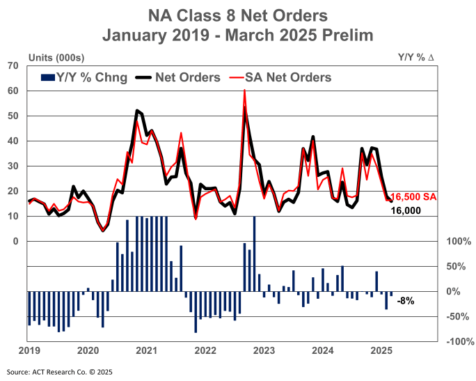ACT Research’s March Class 8 net orders estimates for March were 16,000, down 8.3% year over year.
