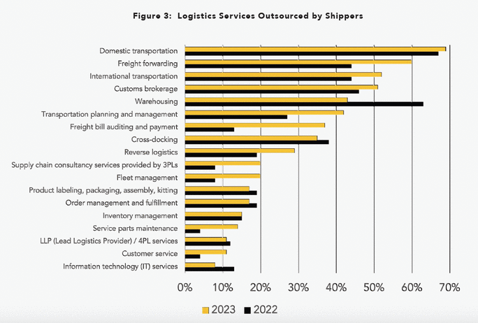 Outsourcing and shipping consolidation drive changes in supply chains. Just over half of shippers — 55% — report increasing their use of outsourced logistics services. That figure is on par with the previous survey.