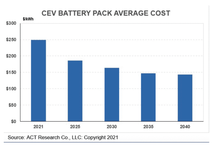 Currently, ACT is estimating the cost of battery packs for OEMs to run around $250 per kilowatt hour. ACT estimates that with volume production, that will drop to $164 by 2035 and to $143 by 2040.