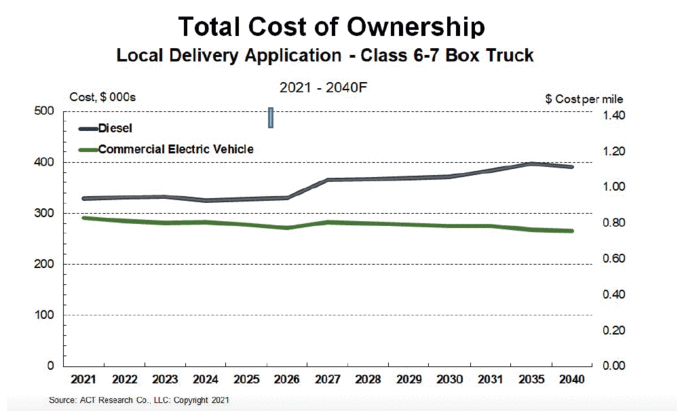 In fact, ACT’s findings show that for most Class 4-8 commercial vehicle operations, the total cost of ownership for electric vehicles is already below that for internal-combustion vehicles.