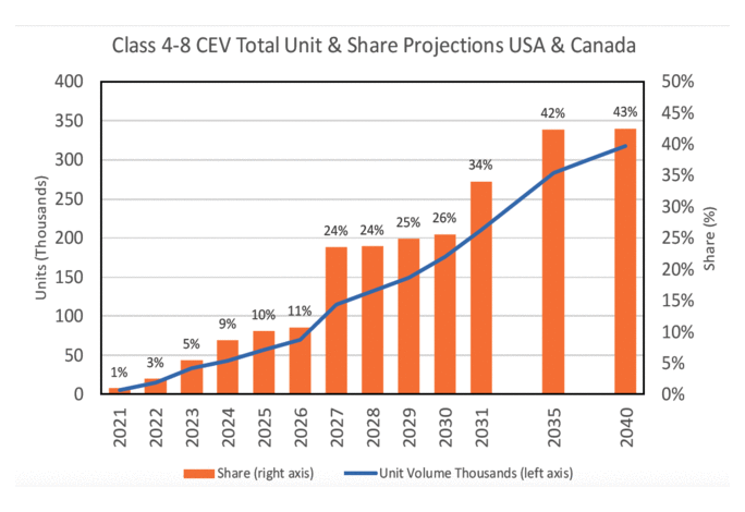 With the total cost of electric-vehicle ownership for some commercial applications already beating out internal-combustion engines, ACT Research predicts that electrification of the Class 4-8 commercial vehicle market in the U.S. and Canada will top 40% by 2040 – with a third of the market migrating to battery-electric solutions in the next 10 years.