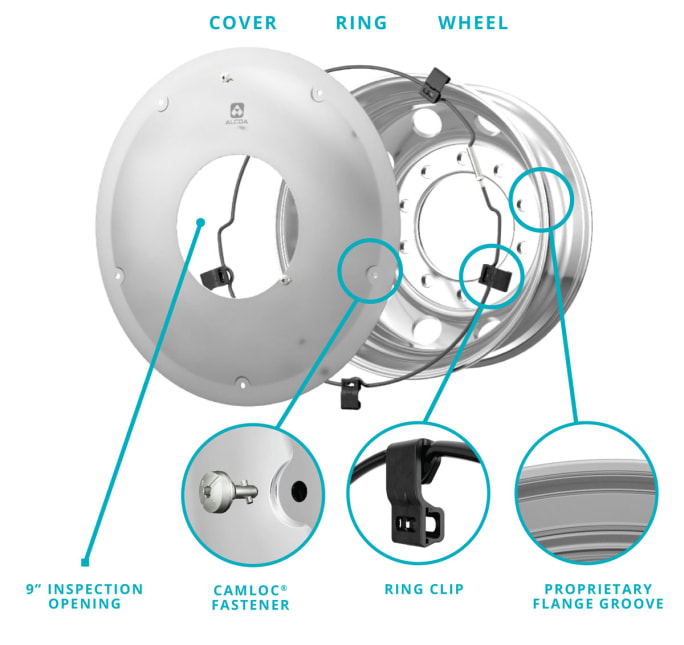 Its innovative design features a unique approach to attachment. The cover provides a measurement-free installation process. Initial system installation takes less than four minutes per wheel, according to Alcoa, with one-time ring installation. Camloc ¼ turn Quick Release Fasteners lock and unlock in seconds.