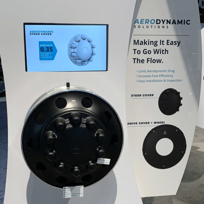 Alcoa's new aerodynamic steer wheel cover on display at TMC.