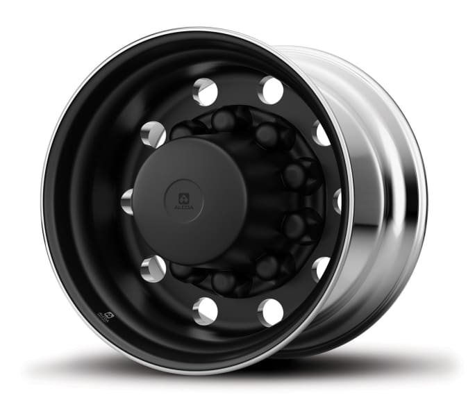 The 22.5” x 14” wheel also is offered with Alcoa’s proprietary Dura-Black surface treatment. Alcoa Dura-Black Wheels offer the same advantages as all lightweight Alcoa forged aluminum wheels. Manufactured using proprietary technology and production processes designed for appearance and durability, Alcoa Dura-Black wheels feature premium detailing in all aspects of the wheel design and production. Beyond the matte black surface, each wheel rim flange and mounting surface appear bright, and in contrast to the matte black face of the wheel. The bright rim flange provides increased protection during tire mounting and while in use out on the road. The bright disc face mounting surface provides protection when mounting and while in use on the rig.