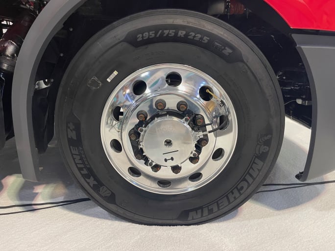 Closeup view of Aperia's new steer-position tire inflation system at the 2026 TMC Annual Meeting.