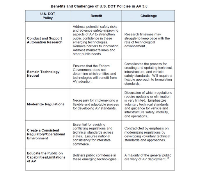 One of the key policy areas discussed in the DOT’s report is cooperative automation and connectivity. This relates to the how complementary to automation technology, whether its vehicle-to-vehicle, vehicle-to-infrastructure or vehicle-to-everything, can help. Other potential uses of cooperative automation include:
