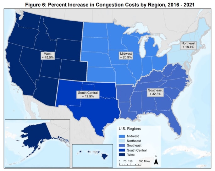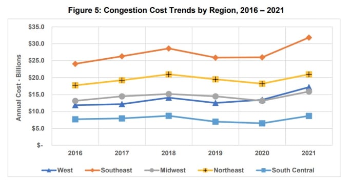 The region with the highest congestion costs remained the Southeast, followed by the Northeast. The West, however, saw the largest percentage increase in congestion costs from 2016 to 2021, followed by the Southeast.