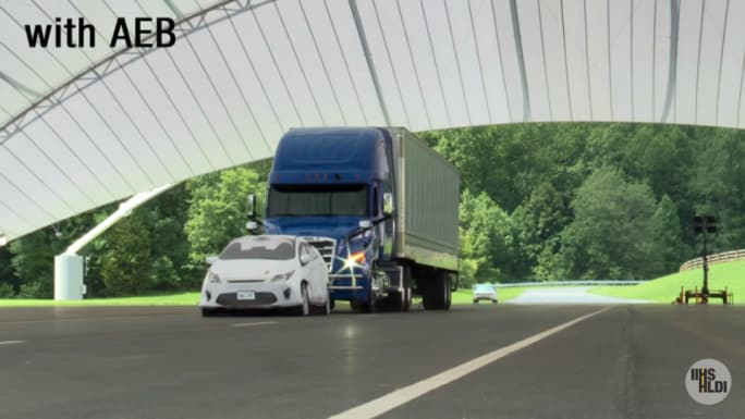 In an Insurance Institute for Highway Safety test of automatic emergency braking, a truck with AEB came to an emergency stop behind the test "car," lights flashing and horn sounding, without the truck driver touching the brake pedal.