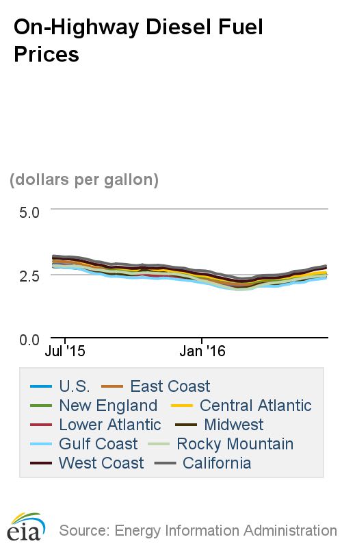 By region, prices were up in all areas, with the largest increase occurring on the West Coast at 3 cents per gallon. The smallest change in prices was in the Lower Atlantic region with an increase of 0.9 cents per gallon.