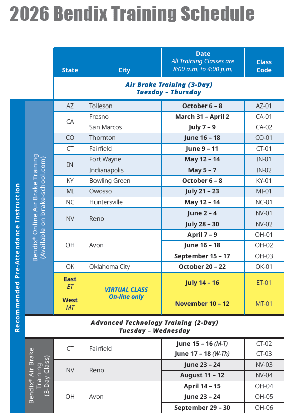 The 2026 calendar includes 16 sessions of Bendix’s three-day Air Brake Training class, which begins March 31-April 2 in Fresno, California.