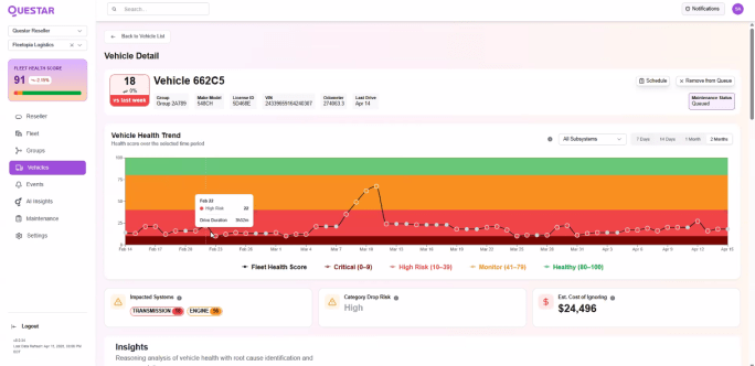 “Rather than reacting to isolated fault codes,” Josef said, “Questar applies data-driven prediction models to calculate failure probability and estimated cost of inaction, giving fleets foresight into what is likely to fail and when.”