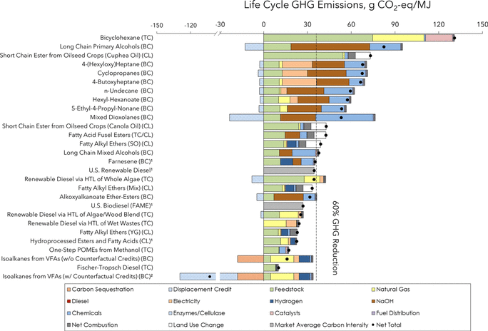 Life cycle greenhouse gas emission breakdown bioblendstocks. The vertical dashed line corresponds to a 60% GHG emission reduction from conventional diesel.