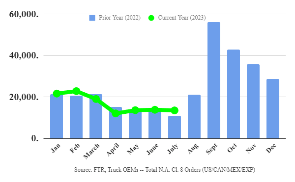 FTR’s chart reflects preliminary Class 8 orders at 13,500 units, which exceeded July 2022 orders.