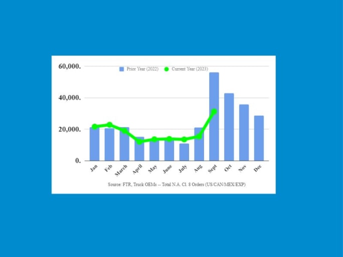 ACT Research reports September preliminary North American Class 8 net orders were 36,800 units, a 67% month-over-month increase, reflecting the strongest order month in the past year. FTR reported Class 8 orders for September at 31,200 units, up 94% versus August, according to its numbers.