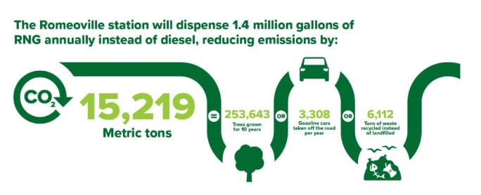 By dispensing 1.4 million gallons of RNG annually instead of diesel, the Romeoville station will reduce carbon emissions by 15,219 MT metric tons.