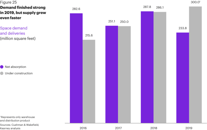 In 2019, the supply of warehouse space grew, but demand grew equally fast. Trends in e-commerce, inventory on hand, and reshoring will increase warehousing demand, but likely more for automated urban warehouses compatible with shared-use networks.