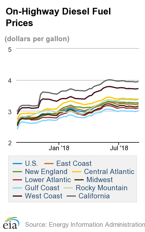 U.S. diesel prices were up nearly 2 cents per gallon from a week ago and more than 6 cents per gallon compared to a year earlier, as crude oil prices rose to their highest since early July.