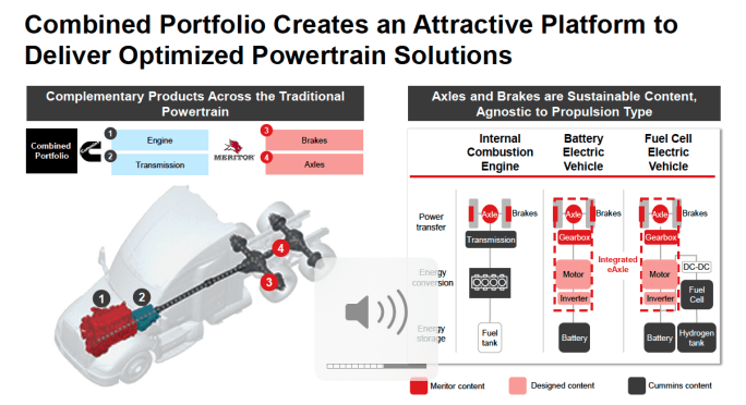On the traditional powertrain side, Linebarger explained that Meritor’s core axle and brake business brings powertrain-agnostic components to Cummins, and it expects to use its global reach to raise growth rates in these businesses.
