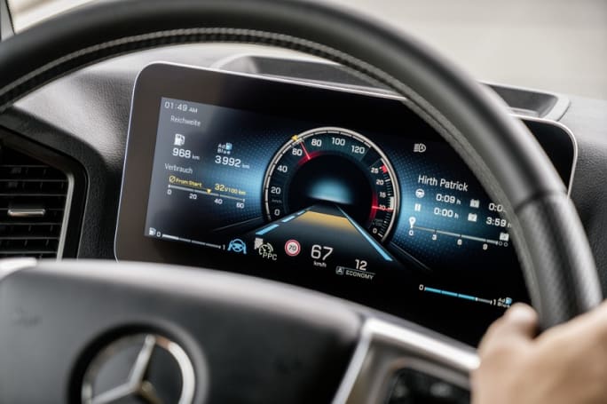 This feature builds on adaptive cruise control to put partially automated driving into series production. The new Active Drive Assist can brake, accelerate and steer independently. Unlike systems that only work at certain speeds, Active Drive Assist offers the driver partially automated driving in all speed ranges for the first time in a series-produced truck, according to Daimler. New elements are the active latitudinal control and the combination of longitudinal and lateral control in all speed ranges through the fusion of radar and camera information. If the truck drifts from its lane, it can automatically steer itself back. “It’s an important step to support the driver, especially on long-distance routes and in annoying traffic jams,” Buchner said. “But as we are still in partly automated mode, he still has his hands on the steering wheel.”